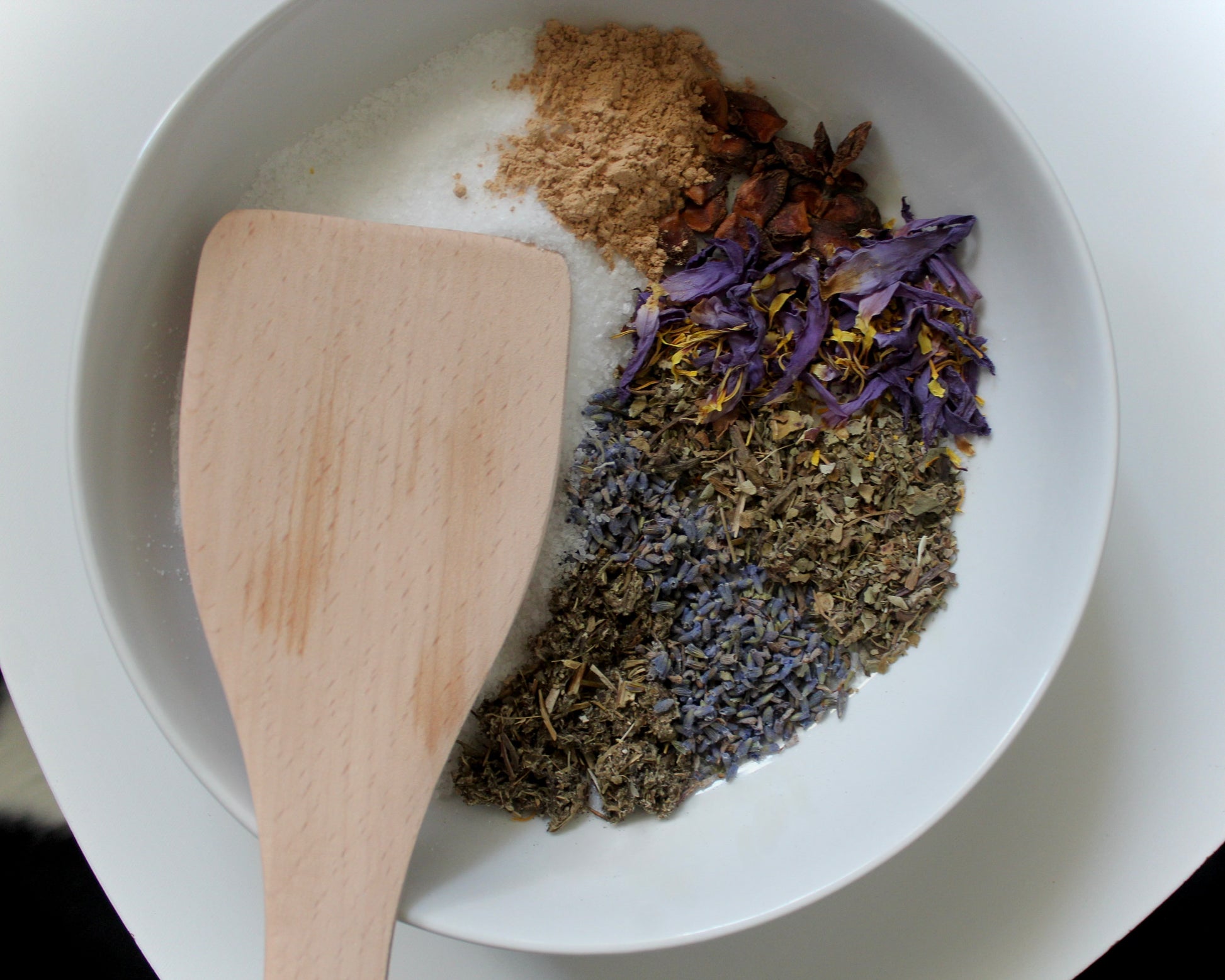 Ingredients: Epsom salt, mugwort, blue lotus, lavender, star anise, coltsfoot leaf, sandalwood, frankincense essential oil.