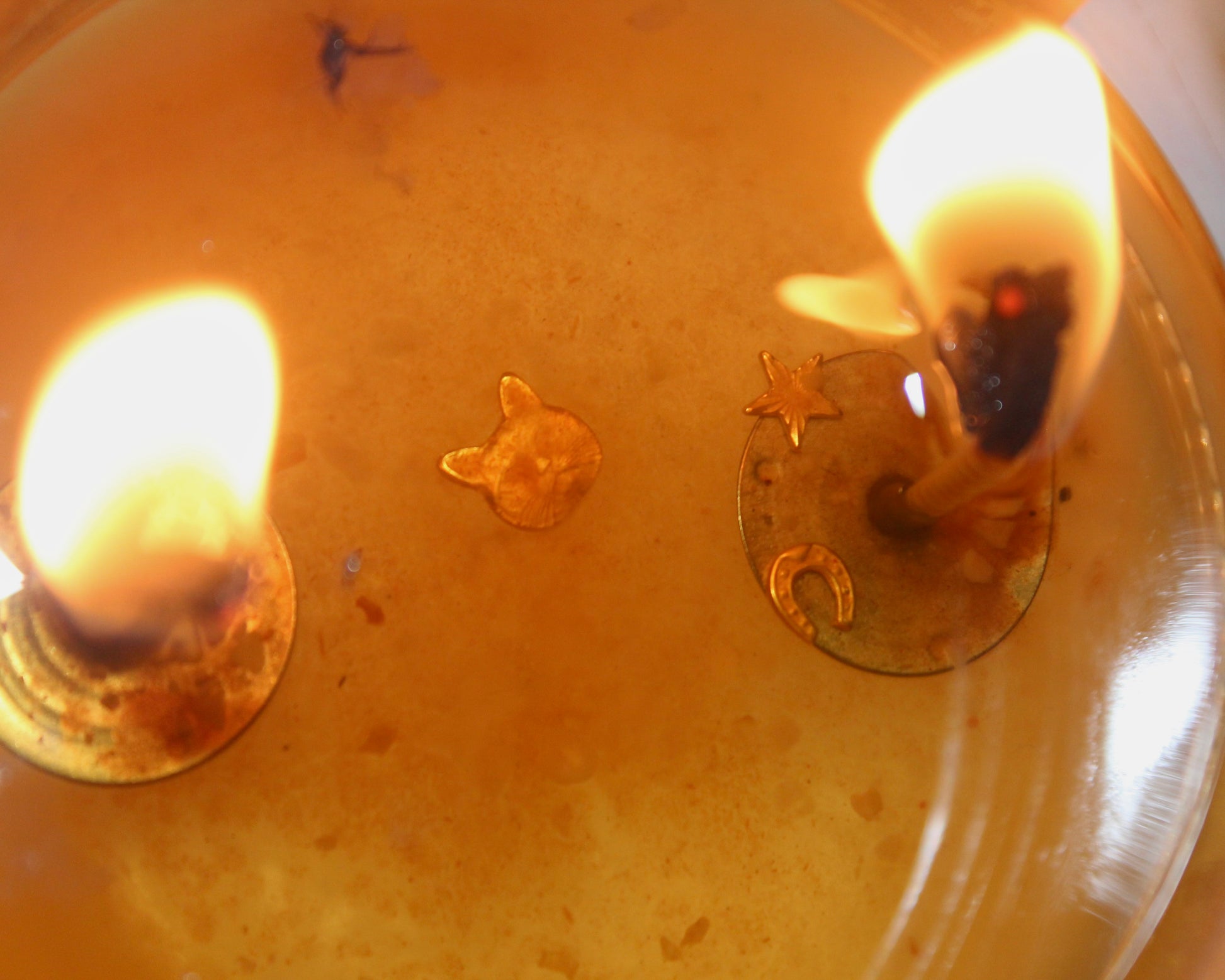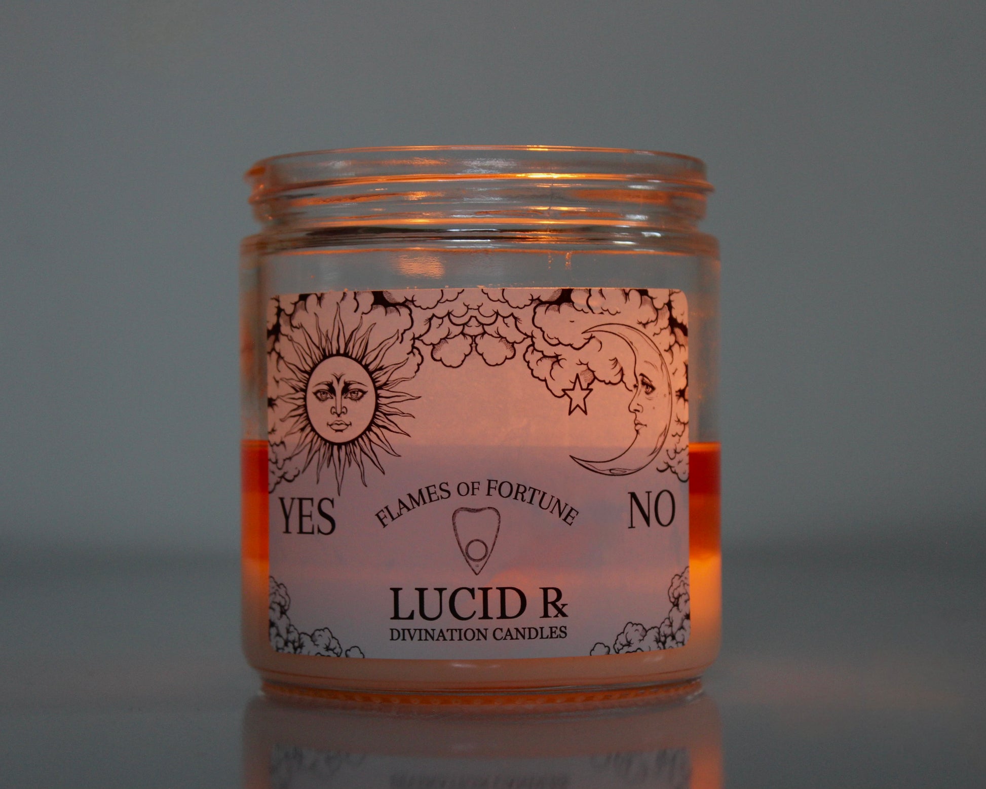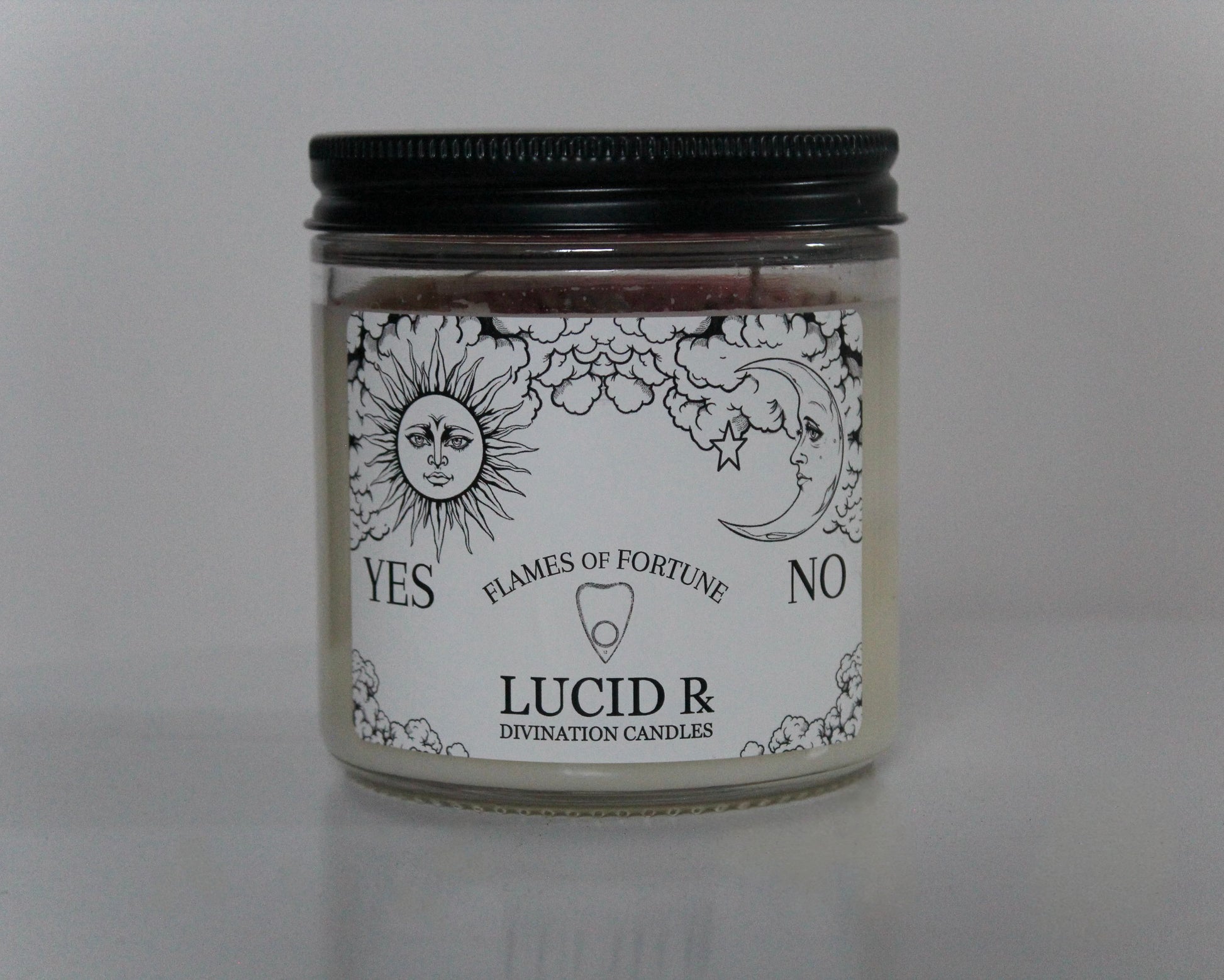 Yes or No Divination Candle. Original label art features a vintage, spirit-board-inspired design with planchette imagery. Designed for seekers who want clarity. The imagery and charms lend themselves to yes/no-style readings. Observe which side most charms lean toward, if any black soot appears, or when one wick extinguishes while the other continues for some time — let these moments speak to you. The flames will always hold nuance for those willing to look deeper.