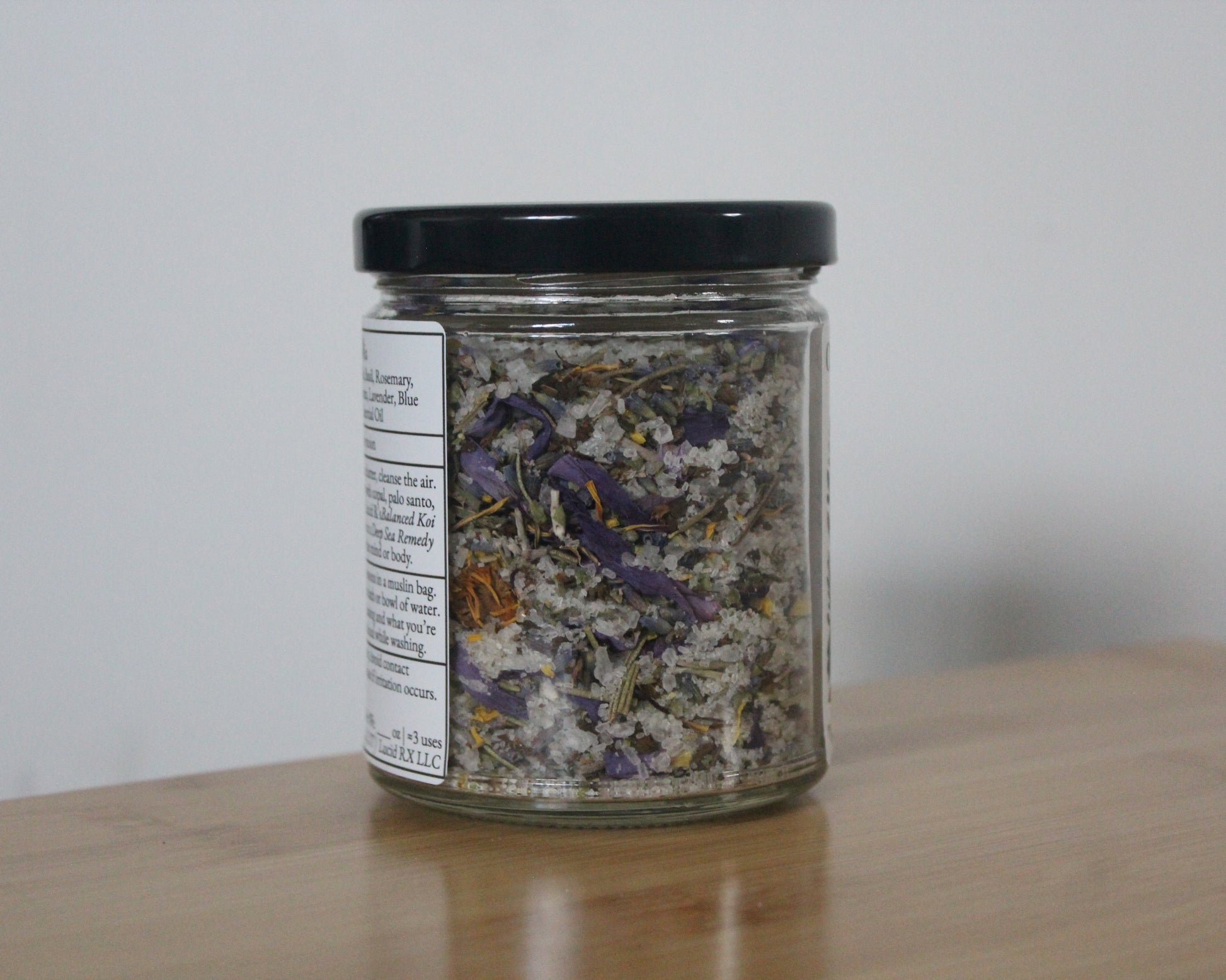 Ingredients: Sea salt, epsom salt, basil, rosemary, marjoram, lavender, blue lotus, patchouli essential oil.